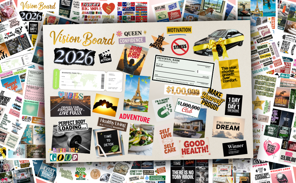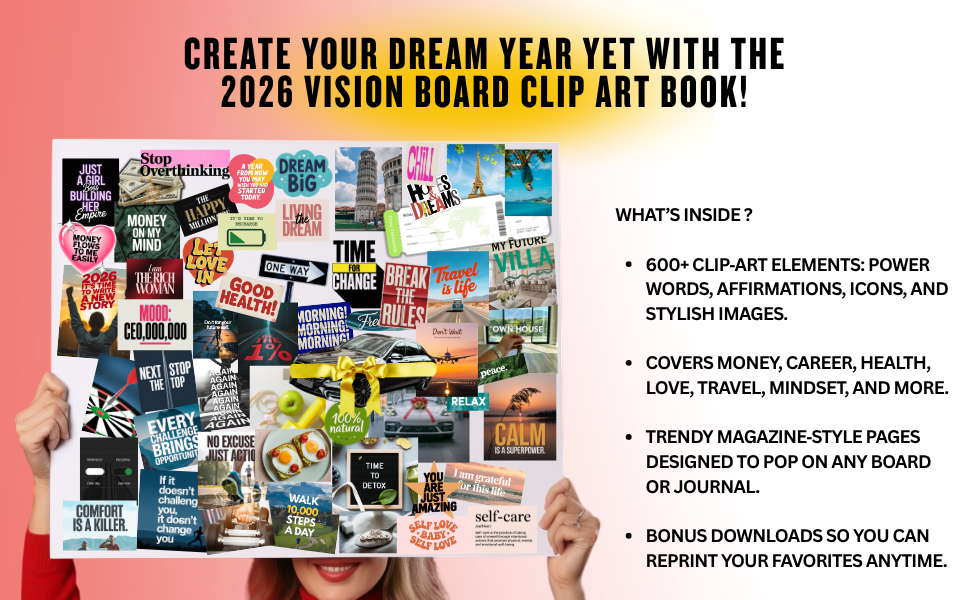 Are you ready to make 2026 the year you design the life you deserve? This Vision Board Clip Art Book is the ultimate toolkit for manifestation, goal-setting, and the law of attraction. With over 600+ powerful words, affirmations, quotes, and stylish images, you’ll have everything you need to create a vision board that keeps you motivated every single day.